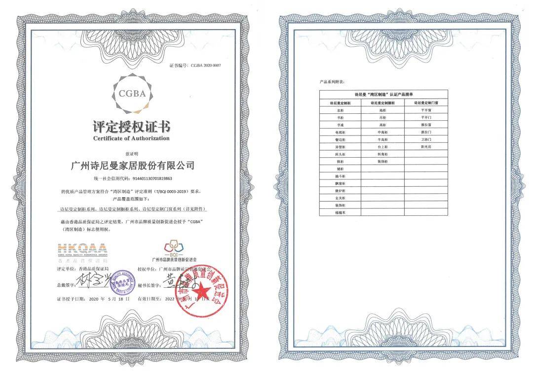 产品是企业走向全球化的核心竞争力,诗尼曼优质的产品管理方案符合“湾区制造”评定准则要求,被授予“CGBA”(湾区制造)标志使用权。并将以此为动力和目标,努力打造以产品为核心的大湾区优秀企业,向世界舞台展示民族企业的华彩与光芒!