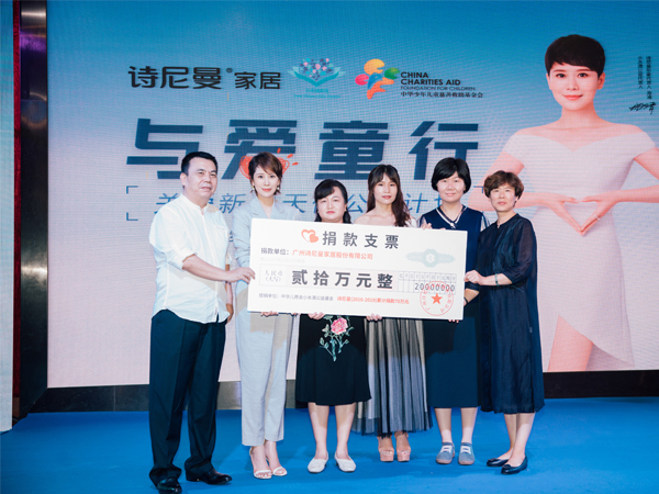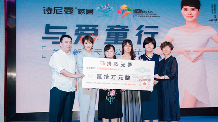 诗尼曼积极履行社会责任,为社会持续创造价值。2012年积极响应国内影响深远的“用爱照亮明天”光头行动, 2013年鼎力支持“阳光天使、点燃梦想”读书站建设,2015年首创关爱4类家庭健康居家活动日, 2016年持续对“小水滴新生”进行公益资助,2018年与中华儿慈会发起“与爱童行”关爱新生天使公益计划, 并将“诗尼曼全国旗舰店工艺角”规划落地,持续为小水滴公益进行资金和物资资助。近十年来,诗尼曼一直 关注并助力儿童治疗、文化教育等慈善公益。